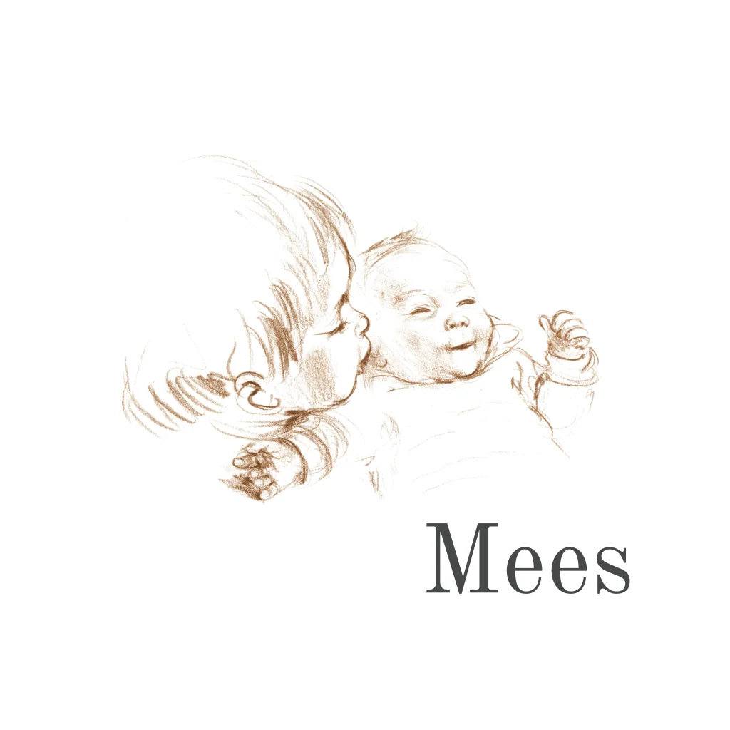 Geboortekaart voor de geboorte van een tweede kindje van een pentekening in sepia met een baby in de armen van een grotere broer of zus. Een klein hartje en spetters in goudfoliedruk.