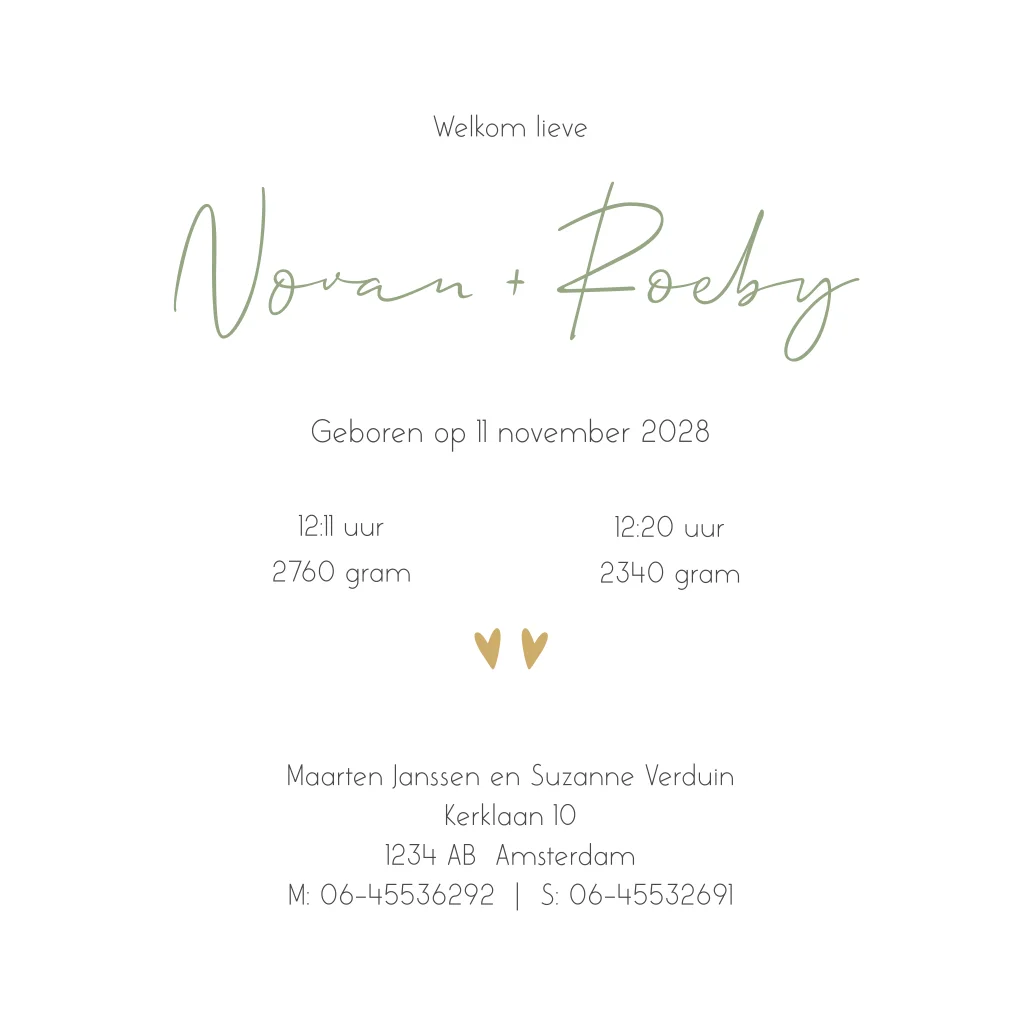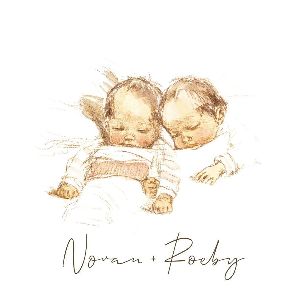 Geboortekaartje voor een tweeling van een pentekening in kleur van twee slapende baby's