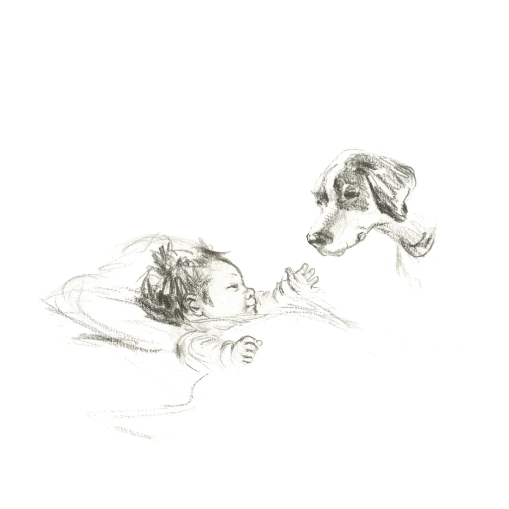Geboortekaart met een pentekening van een baby die vrolijk naar een pointer hond kijkt. De naam, spetters en hartjes aan de voor- en achterzijde staan in roségoudfolie.