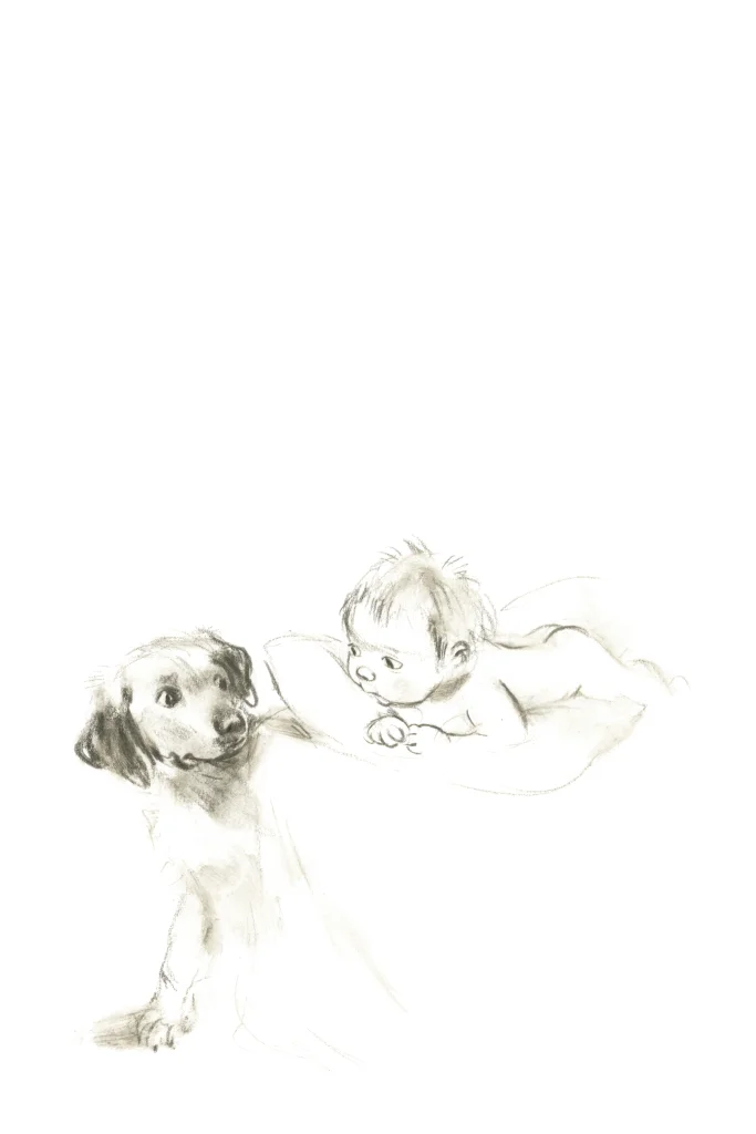 Staand geboortekaartje met ronde hoeken met een pentekening van een labrador hond die naar de baby kijkt en aan beide zijden van de kaart roségoudfolie voor een extra wow-effect.