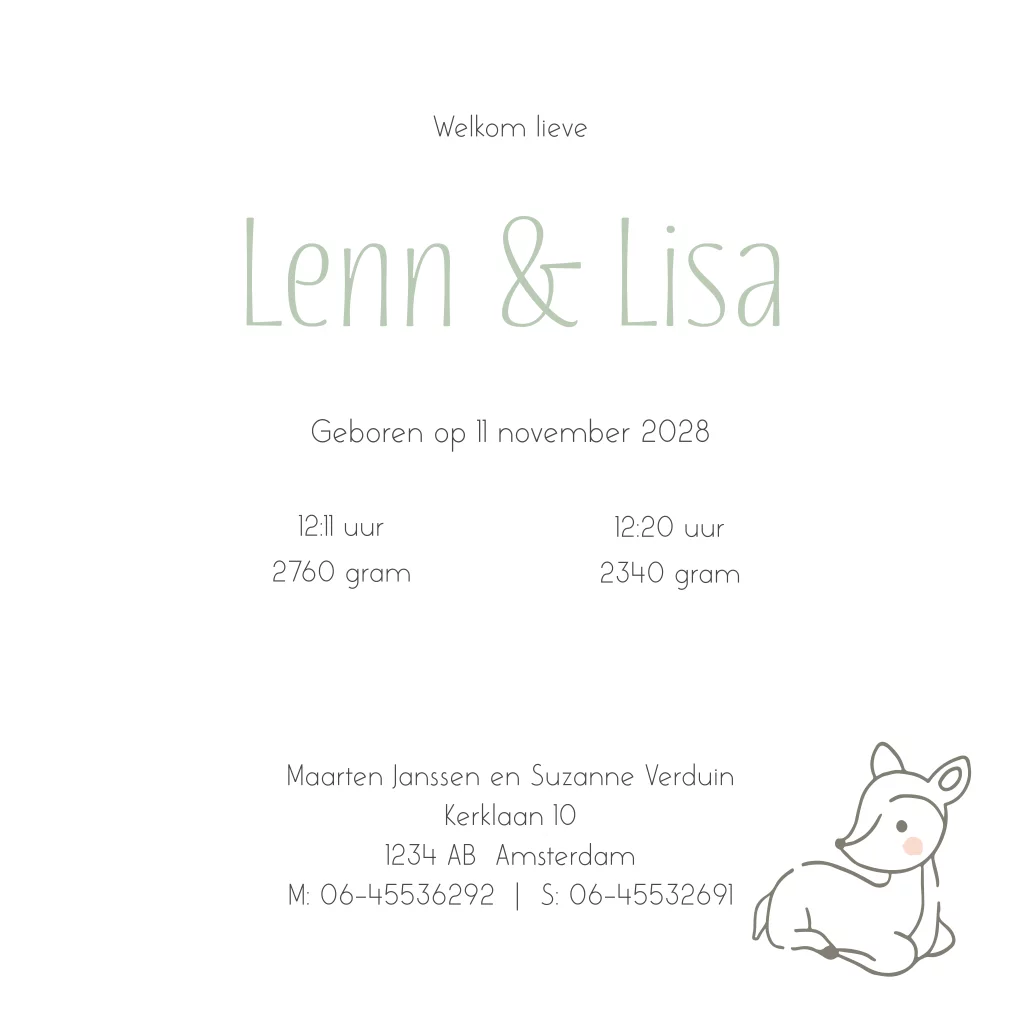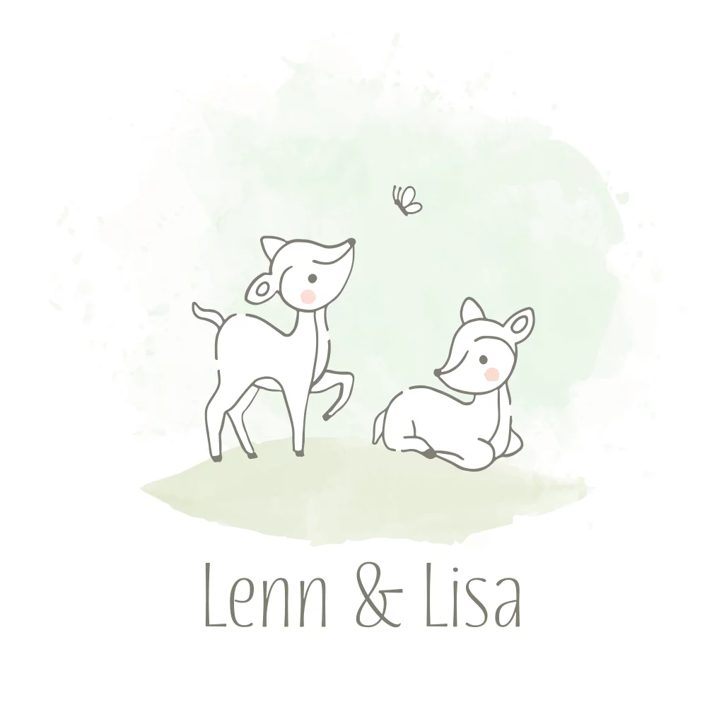 Geboortekaart voor een tweeling jongen en meisje met twee hertjes en een vlinder in grijze lijntekening met groene watercolor in de achtergrond.