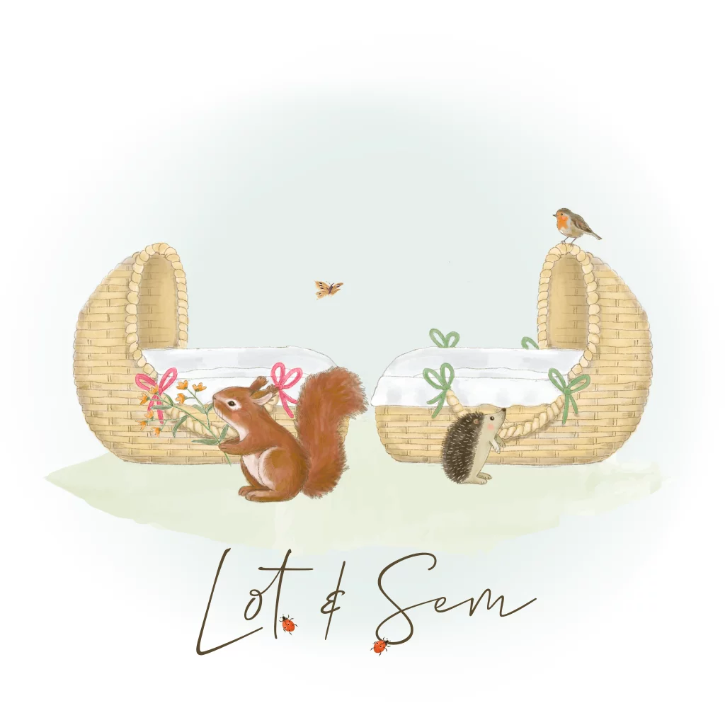 Lief geboortekaartje voor een tweeling met twee rotan wiegjes. Een mandje met roze strikjes en het ander wiegje met groene strikjes met een eekhoorn, vlinder, egel, roodborstje en twee lieveheersbeestjes eromheen. In de achtergrond een mintgroene watercolor vlek.