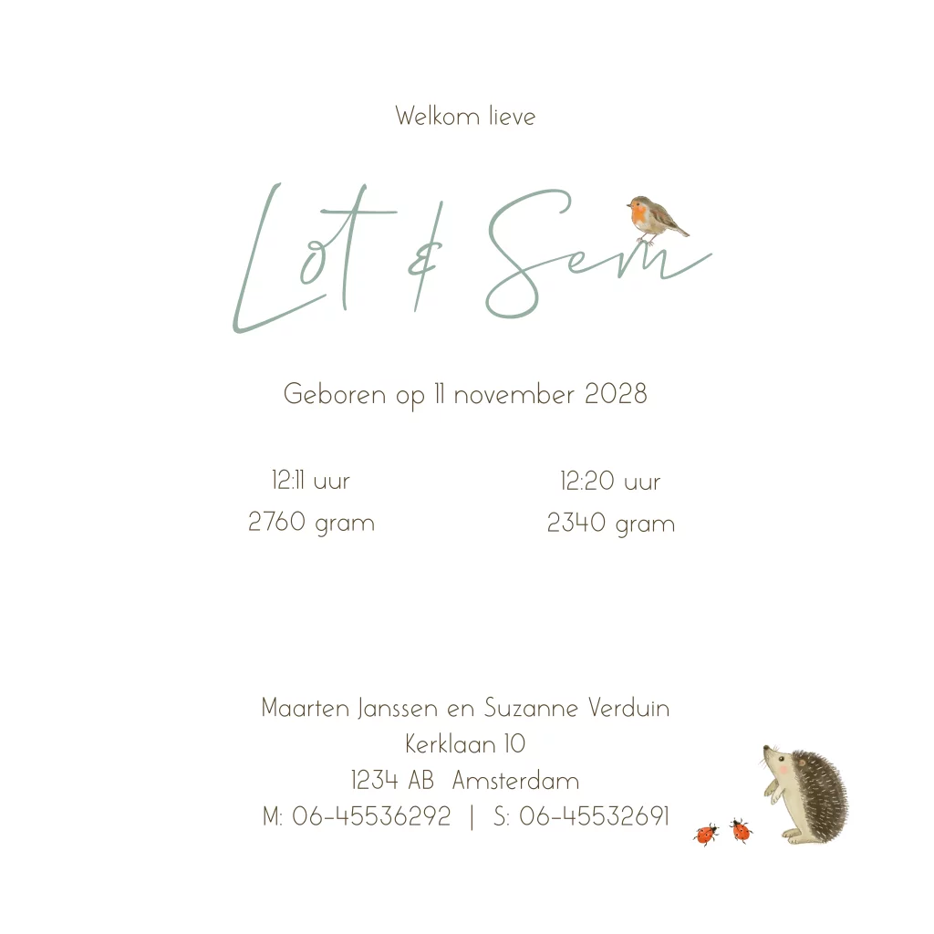 Geboortekaartje tweeling rotan wiegjes bosdieren