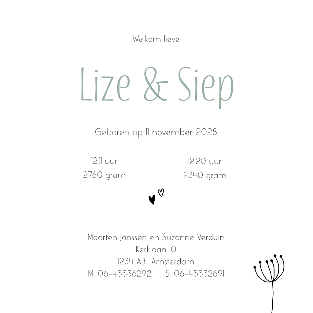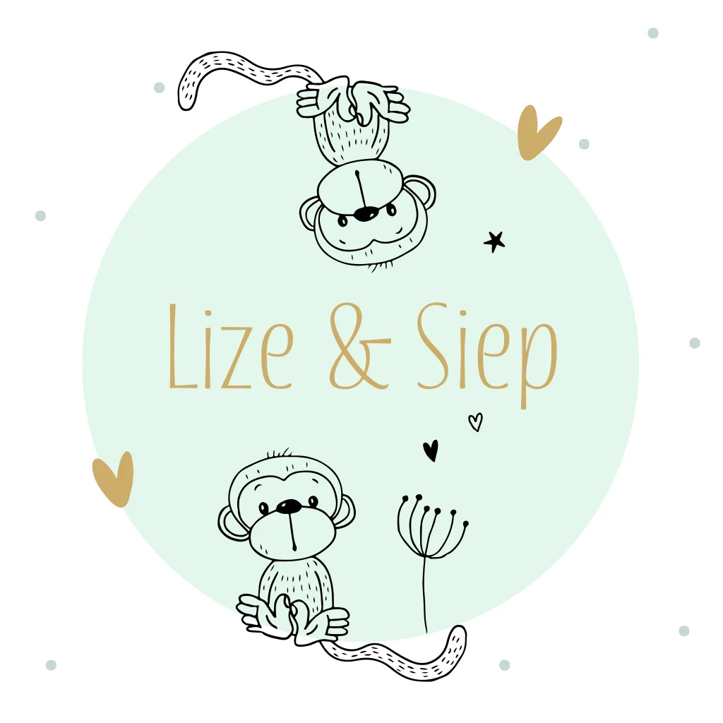 Geboortekaartje voor een tweeling met twee vrolijke aapjes in zwarte lijn op een mintgroene cirkel met confetti en hartjes eromheen. Elementen gemakkelijk aan te passen in de editor.