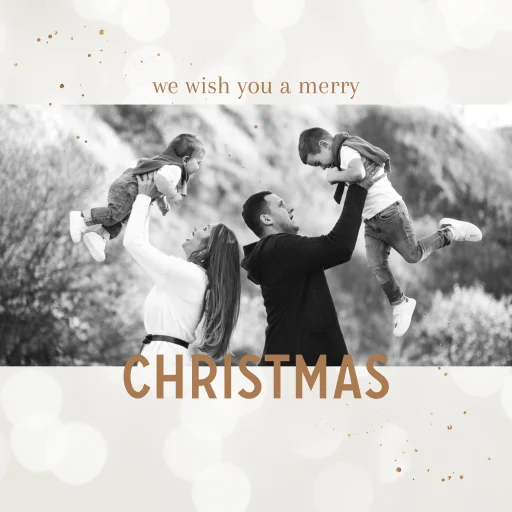 Een keramieken tegeltje met de tekst "we wish you a merry Christmas" in een bruine kleur op een beige achtergrond en een foto in zwart / wit. De kleur van de tekst kun je zelf aanpassen. Een messingkleurig ophanghaakje wordt meegeleverd.