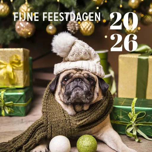 Een keramieken tegeltje met een vrolijke foto van een hond met muts onder de kerstboom met cadeautjes en de tekst "Fijne feestdagen 2026" in wit. De kleur van de tekst en de tekst zelf kun je naar wens aanpassen. Een messingkleurig ophanghaakje wordt meegeleverd.