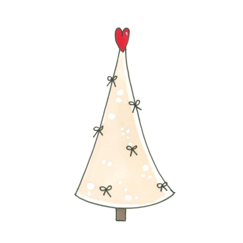 Sluitzegel voor kerstkaarten met een kerstboom in lichtbeige kleur met strikjes en een hartje als piek. Een sluitzegel is 35 mm groot, 25 stuks per vel.