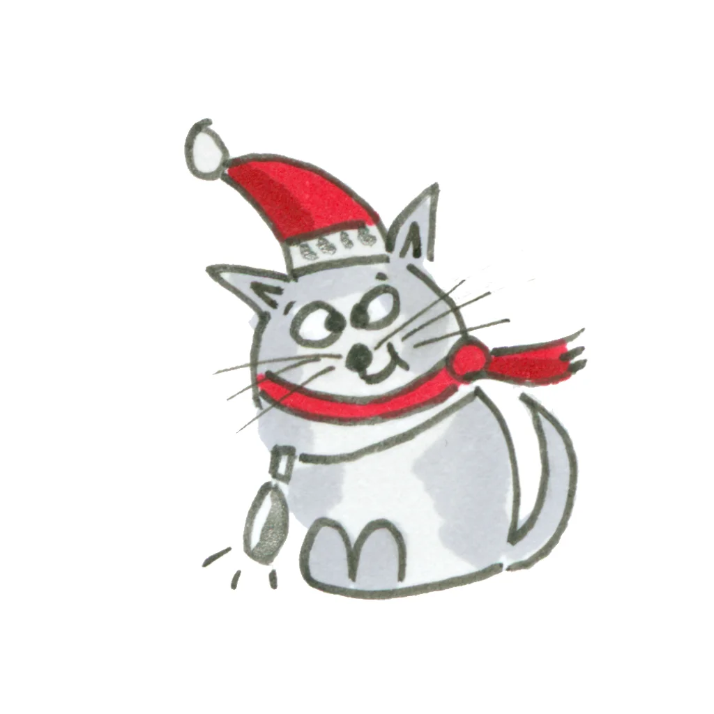 Sluitzegel voor kerstkaarten met een poes met een rode kerstmuts en een lampje om de nek. De grootte van een sluitzegel is 35 mm. 25 sluitzegels per vel.