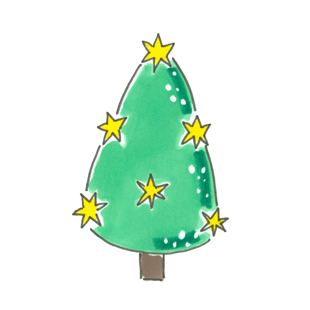 Sluitzegel voor kerstkaarten van een groene kerstboom en gele sterren. Grootte van een sluitzegel is 35 mm. 25 sluitzegels per vel.