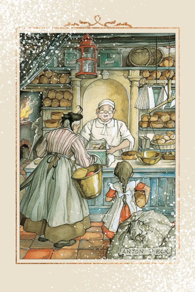 Kerstkaart van Anton Pieck met een illustratie van de uitbeelding van het ambacht bakker met een goudkleurig kader met guirlande en sneeuwvlokken vanuit twee hoeken. Een winkelende vrouw voor de toonbank van de bakkerij om haar gekochte spullen te betalen.
