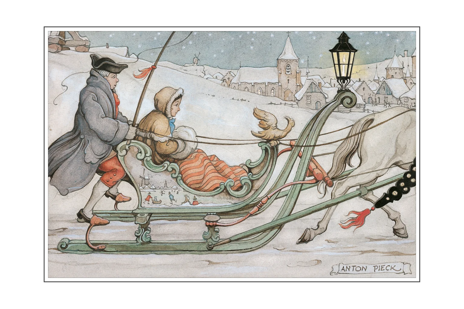 Kerstkaart van Anton Pieck met een dame in de arreslee met paard die door de berijder van de slee door de sneeuw naar de plaats van bestemming gebracht wordt.