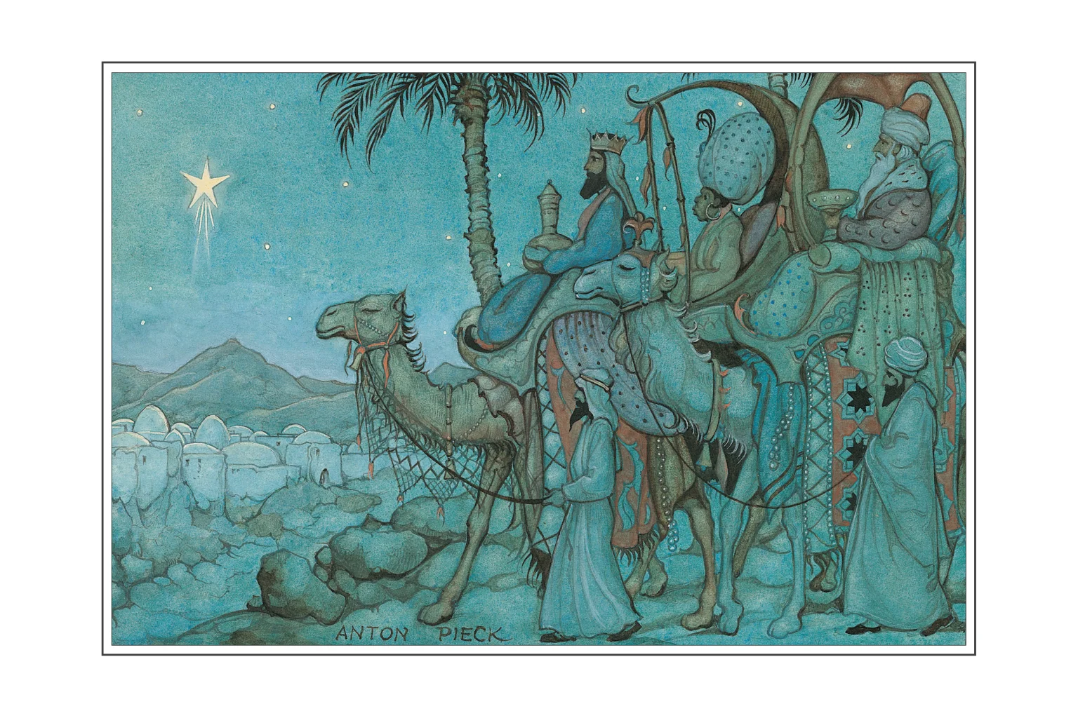 Kerstkaart van Anton Pieck met een illustratie van de 3 koningen die de heldere ster volgen en op weg zijn met hun geschenken naar de pasgeboren Jezus