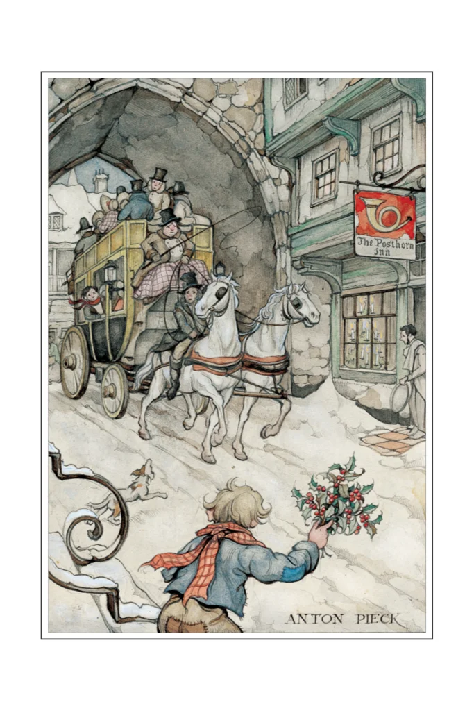 Kerstkaart van Anton Pieck met een jongen die enthousiast met een hulst takje in de hand de besneeuwde straat op rent als de postkoets met paard bepakt met pakjes en mensen de straat in rijdt.