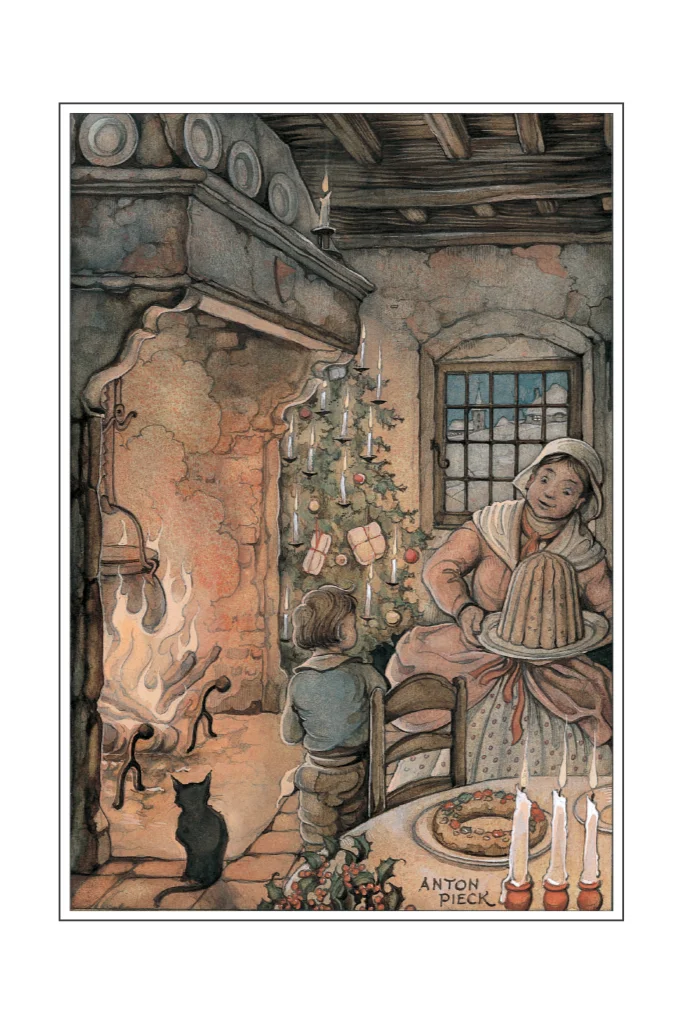Kerstkaart van Anton Pieck met een illustratie van een gezellig tafereel van een kerstavond thuis. Een moeder met een mooie taart in de handen lopend naar een mooi gedekte kersttafel met een kind en kat staand voor de warme brandende open haard en een mooi opgetuigde kerstboom in de hoek van de kamer.