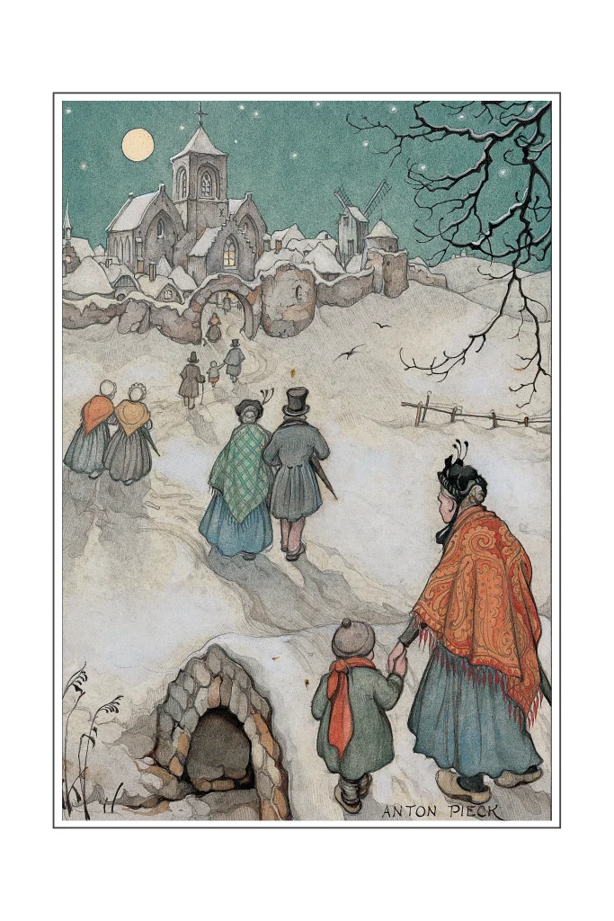 Kerstkaart Anton Pieck met een illustratie van mensen lopend in de sneeuw op weg naar de avondmis in de kerk met een mooie sterrenhemel in de achtergrond.