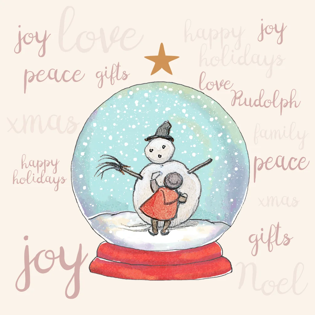 Kerstkaart met de afbeelding van een sneeuwbol met daarin de tekening van een sneeuwpop met kindje van de hand van Anton Pieck met kerst teksten rondom en een kerstster.
