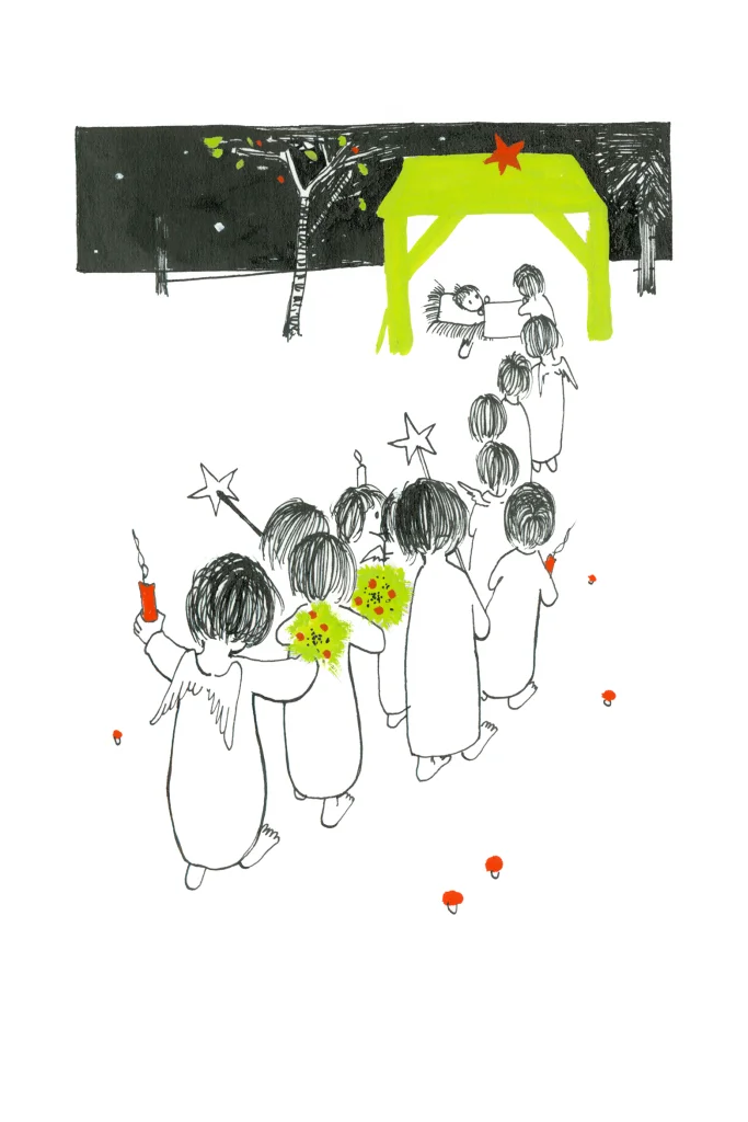 Kerstkaart met verschillende engelen lopend in een rij op weg naar de pasgeboren Jezus die in de kribbe ligt in de stal.