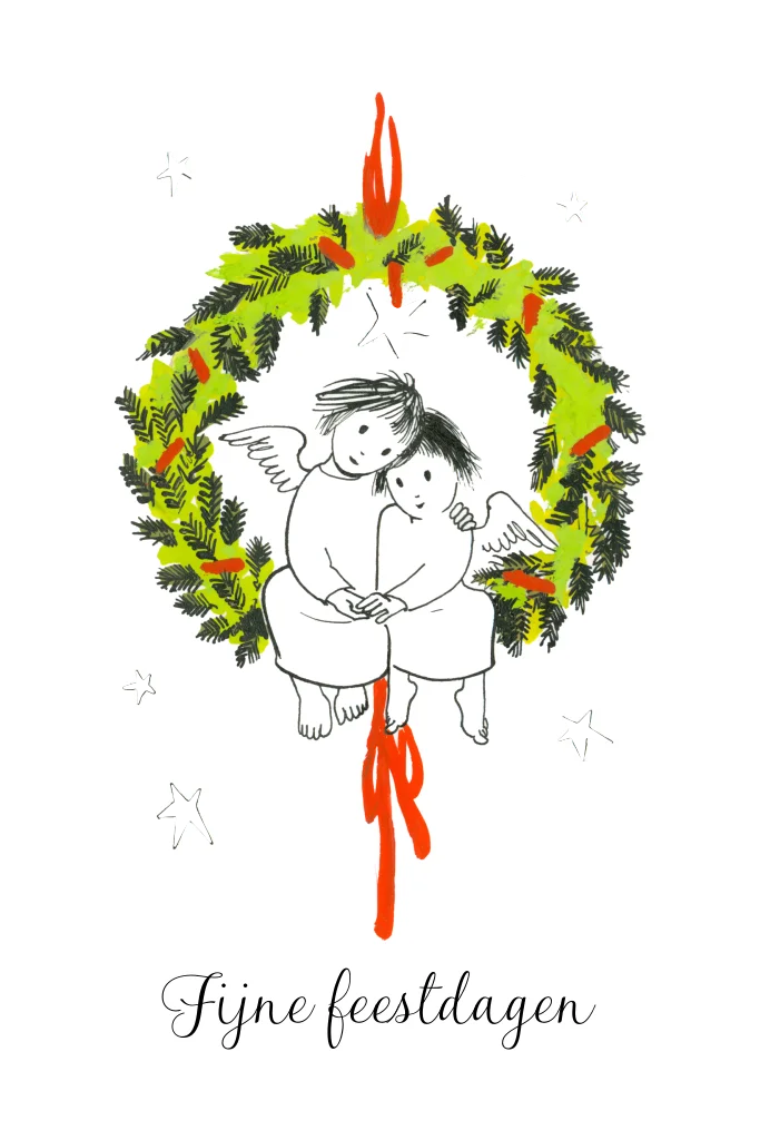 Kerstkaart met 2 engelen zittend in een kerstkrans met sterren eromheen in goudfoliedruk.