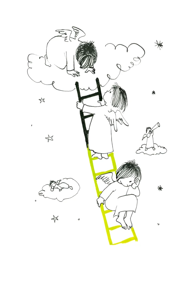 Kerstkaart met 2 engelen op een ladder omhoog lopend naar een engel die op een wolk zit.