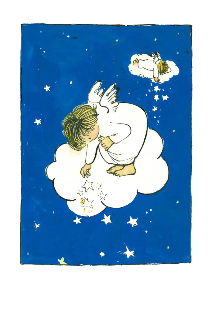 Kerstkaart met 2 engelen op een wolk die sterren omlaag gooien met in de achtergrond een donkerblauwe hemel. Een aantal sterren en de tekst staan in goudfoliedruk.