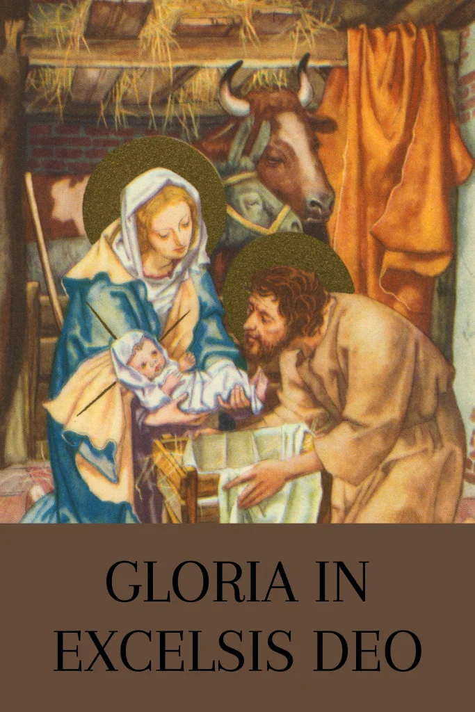 Staande religieuze kerstkaart met een afbeelding van Maria, Jozef en de pasgeboren Jezus in de stal met de os en ezel. De tekst Gloria in excelsis Deo (Eer aan God in den hoge) in een donkerbruine balk. De kleur van de balk en alle tekst is aanpasbaar.