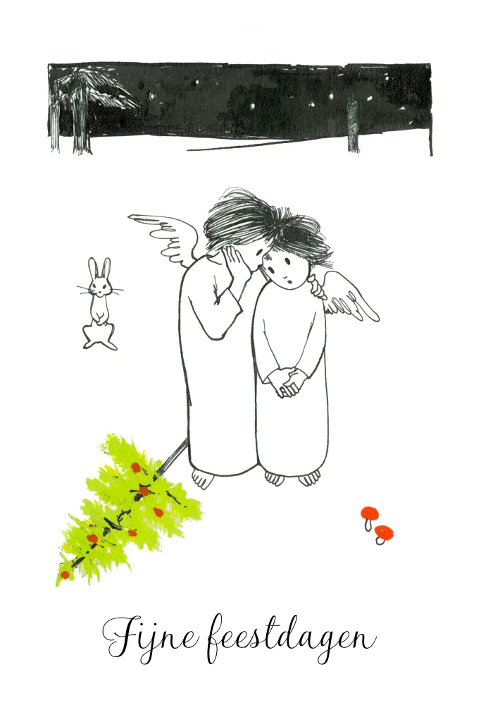 Kerstkaart met twee engelen met een kerstboom in het bos met een haasje in de achtergrond.