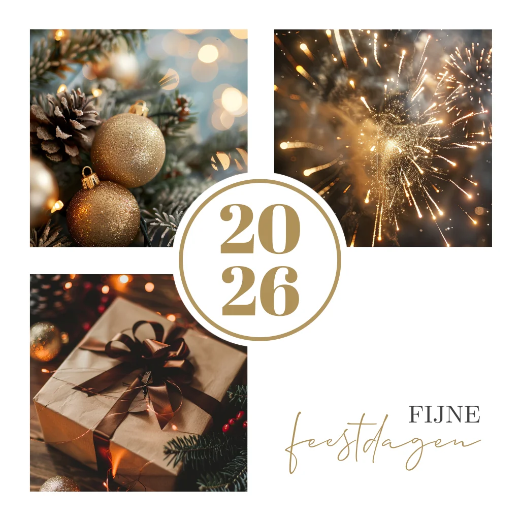 Kerstkaart verdeeld in 4 vlakken waarvan 3 sfeerfoto's van Kerstmis en Nieuwjaar en het onderste vlak recht voor de tekst. In het midden van de kaart het jaartal 2026.