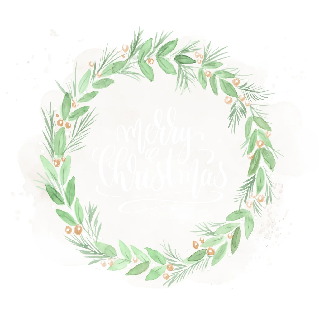 Kerstkaart met een groene kerstkrans van mistletoe takken en besjes met goudfolie stippen ertussen. De tekst en spetters in de hoek staan ook in goudfoliedruk. In de achtergrond van de krans is een lichtbeige watercolor.