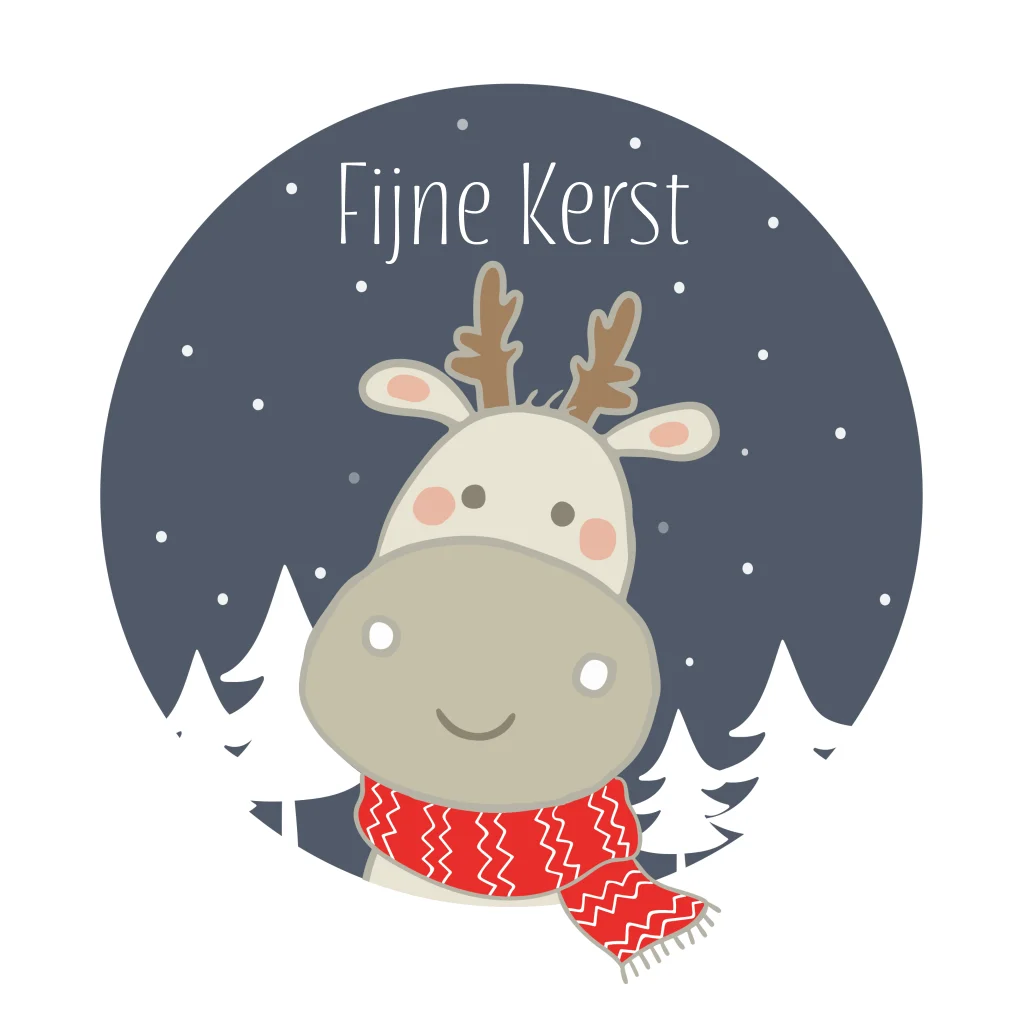 Vrolijke kerstkaart met een nijlpaard met gewei met rode sjaal op een donkerblauwe cirkel met sneeuwvlokken en kerstbomen.