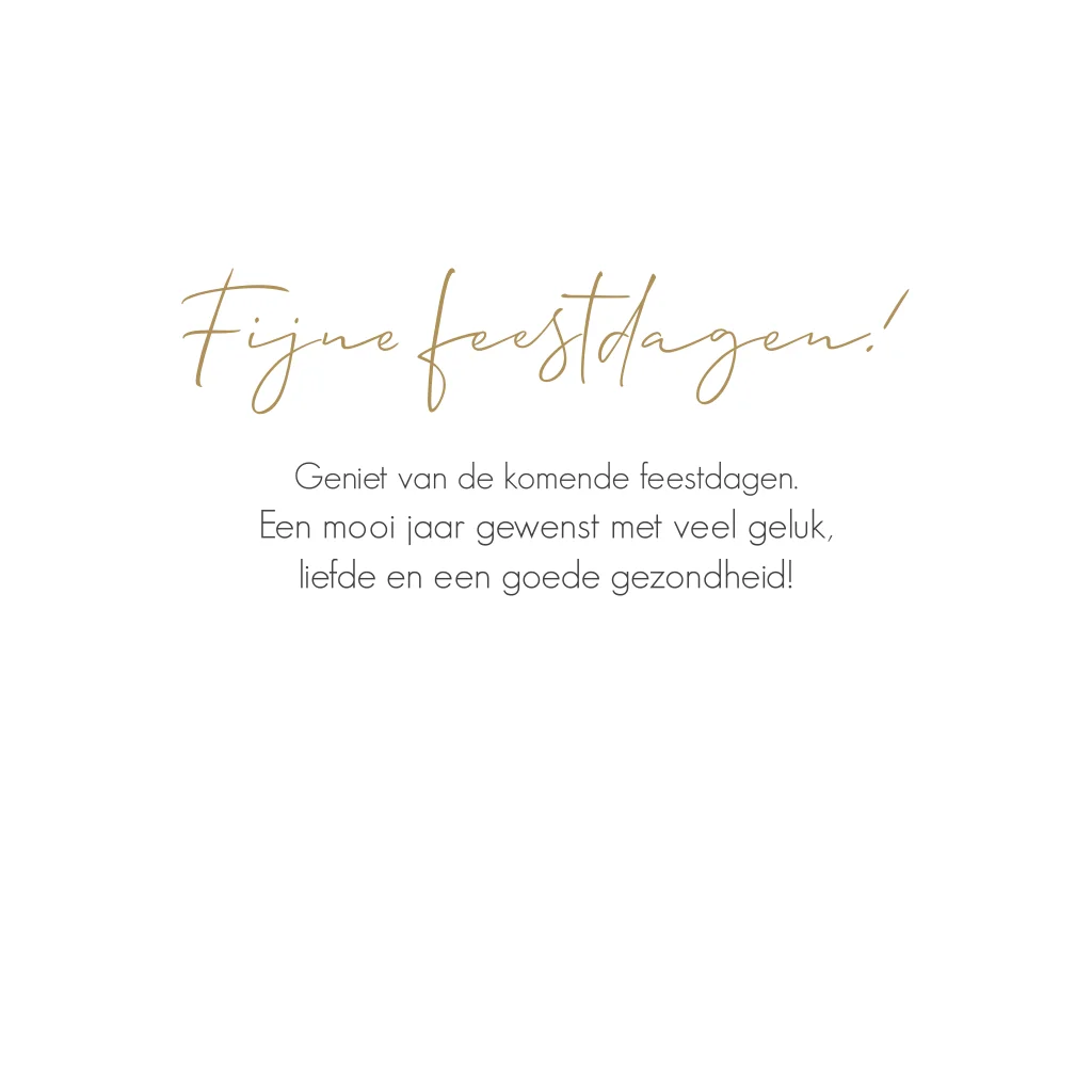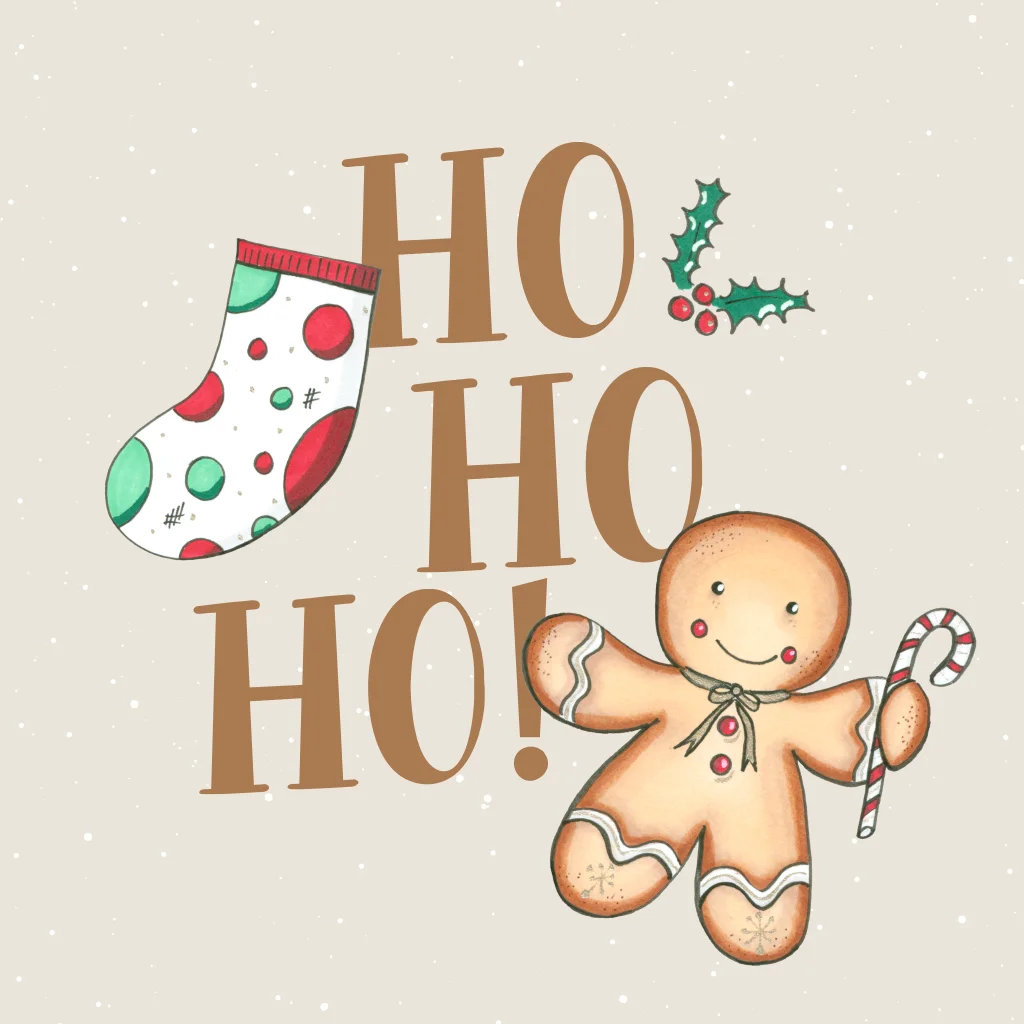 Vrolijke kerstkaart met een peperkoeken manneke, een kerstsok en een hulsttakje rondom de tekst hohoho op een beige achtergrond met witte sneeuwbollen.