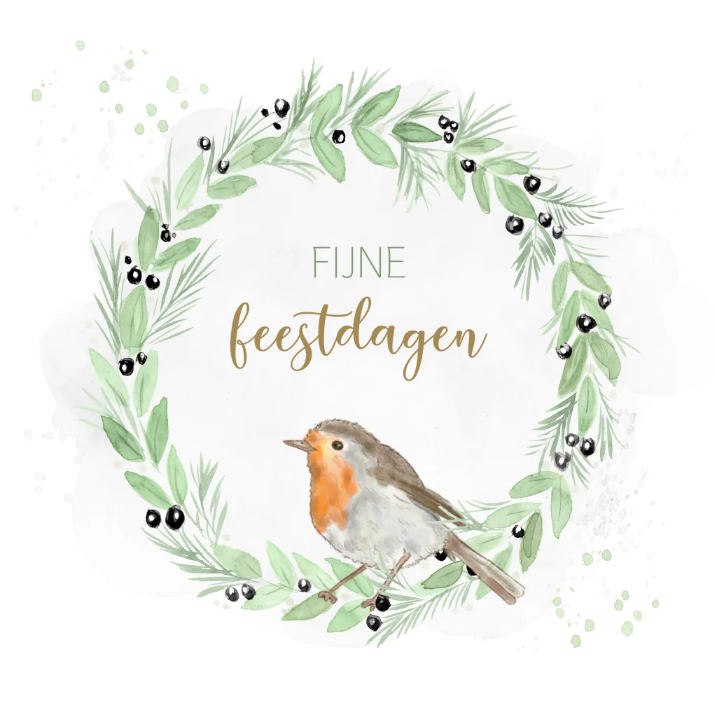 Mooie kerstkaart. met een groene kerstkrans met besjes en een roodborstje met een lichtgrijze watercolor vlek en lichtgroene watercolor spetters in de achtergrond.