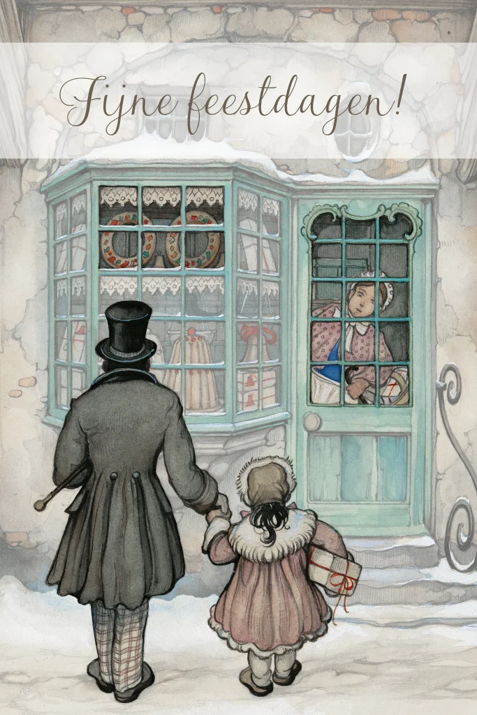 Kerstkaart met een illustratie van Anton Pieck van een man met dochter staand voor een winkel en kijkend in de etalage. De tekst is aanpasbaar en de transparante balk is naar wens te verwijderen.