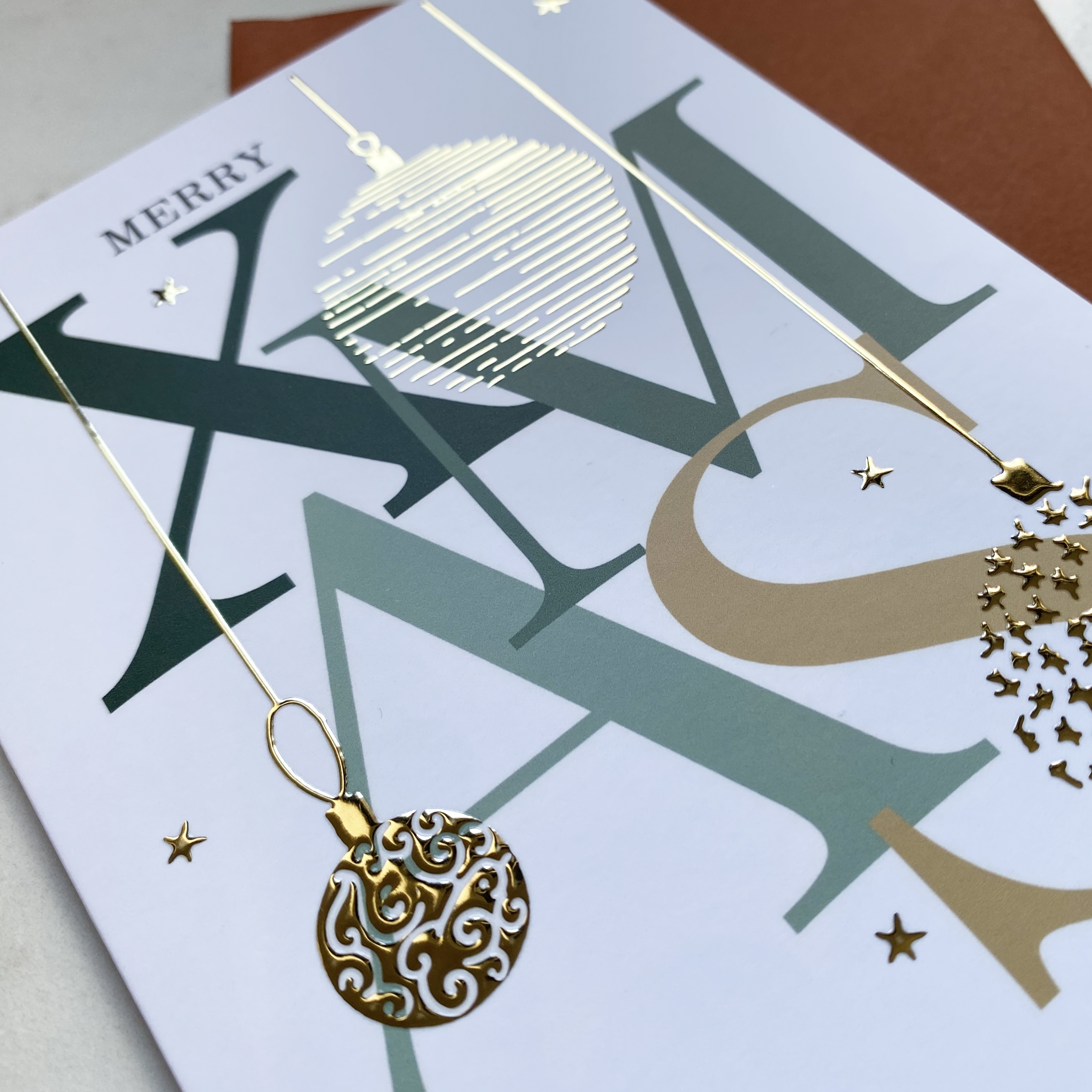 Kerstkaart XMas met kerstballen in goudfolie