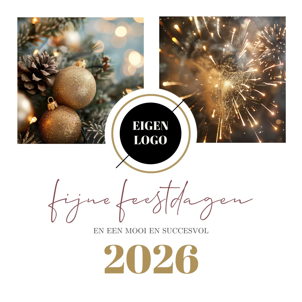 Zakelijke kerstkaart met twee sfeerfoto's van Kerst en Nieuwjaar met een cirkel in het midden voor het eigen logo. De foto's zijn te vervangen door eigen foto's en alle tekst is aanpasbaar.