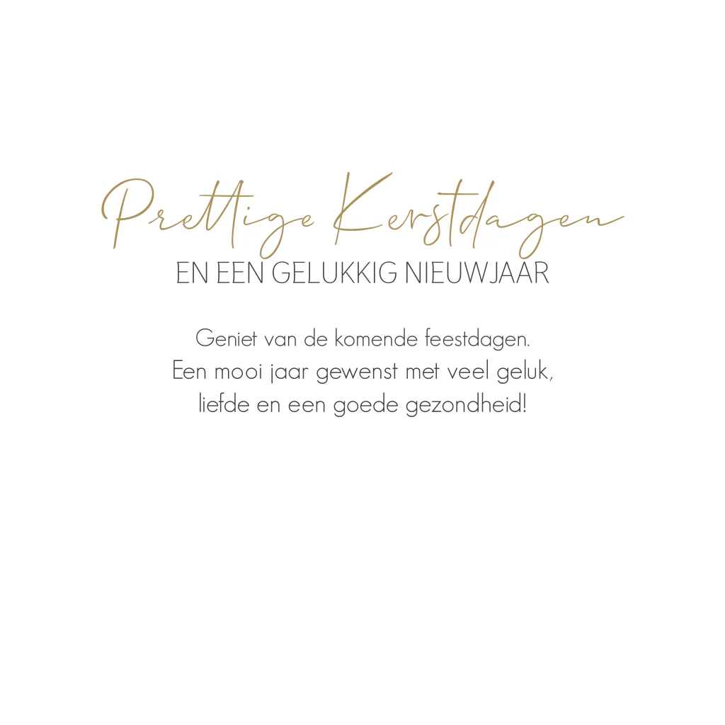 Zakelijke kerstkaart met 3 sfeerfoto's voor de feestdagen en een tekst voor werkrelaties. Alle tekst is aanpasbaar en de foto's zijn naar wens te vervangen door eigen foto's. Onder aan de kaart een balk met goudlook glitter.