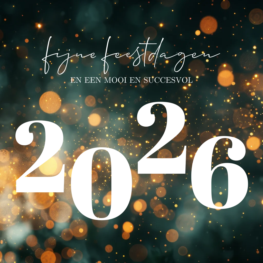 Vierkante zakelijke kerstkaart met een foto van lichtglinstering met warme en donkere tinten met het jaartal 2026 in goudfolie.