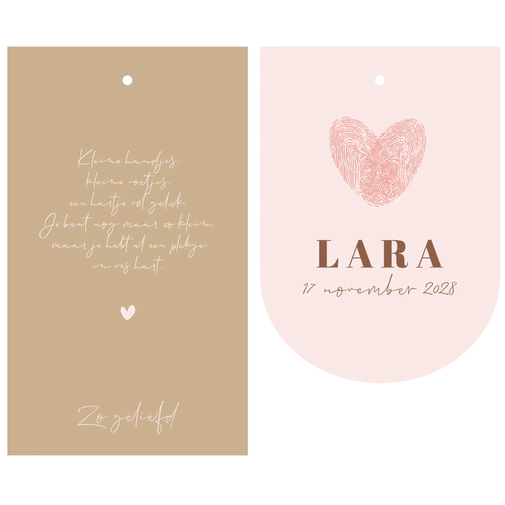 Een geboortekaart als label bestaande uit 2 losse kaarten. De hoofdkaart is de rechthoekige kaart met aan de voorzijde een lichtbruine kleur met een gedichtje, een hartje en de tekst Zo geliefd. Aan de achterzijde is een lichtroze kleur gebruikt en kun je de rest van de geboorte- en adresgegevens plaatsen. De tweede kaart is in boogvorm in de kleur zachtroze met aan de voorzijde de naam met twee vingerafdrukken in de vorm van een hart en op de achterzijde een foto van een pasgeboren baby. Alle kleuren zijn gemakkelijk zelf naar wens aan te passen. De 2 kaarten zijn samen te voegen met een touw, lint of splitpen. Deze dien je los erbij te bestellen. Op onze website zijn verschillende producten verkrijgbaar.