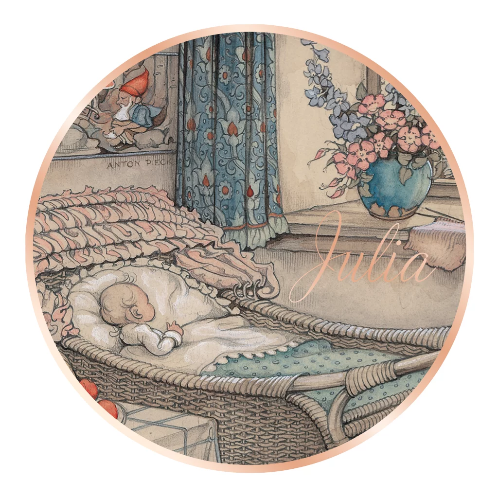 Anton Pieck geboortekaartje meisje ronde vorm wiegje roségoudfolie