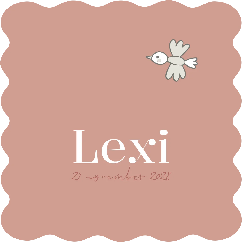 Vrolijk enkel geboortekaartje met een golvende rand en een terra kleur aan de voorzijde met een kleur vogeltje als afbeelding mij de naam en geboortedatum. De achterzijde heeft een beige tint met een leuk klein vlindertje en lieveheersbeestje naast de tekst. Kleuren zijn gemakkelijk te wijzigen.