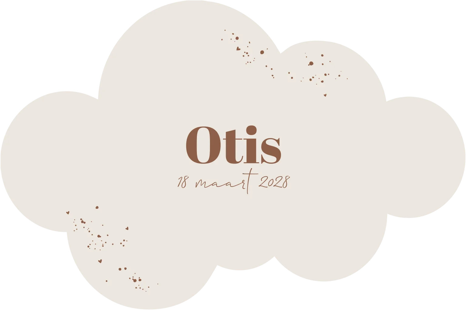 Vrolijk en stoer geboortekaartje voor en jongen in de vorm van een wolk. Aan de voorzijde een beige kleur met de stipjes, hartjes en tekst in het bruin en aan de achterzijde omgedraaid. Alle kleuren zijn gemakkelijk zelf aan te passen.