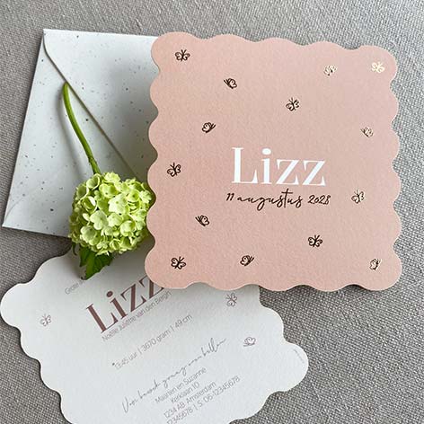 Geboortekaartje meisje met golvende randen vlinders goudfolie