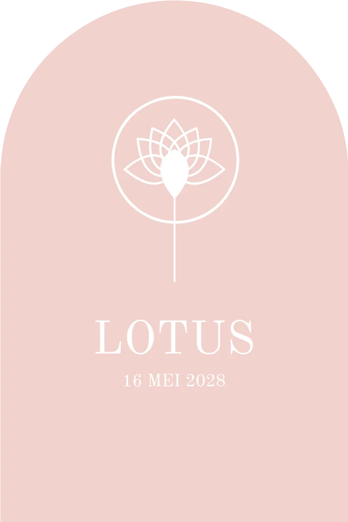 Stijlvol geboortekaartje in boog vorm voor een meisje met een roze achtergrond met daarop in wit in lijntekening de zon en een lotusbloem. De kaart is gemakkelijk naar wens aan te passen.