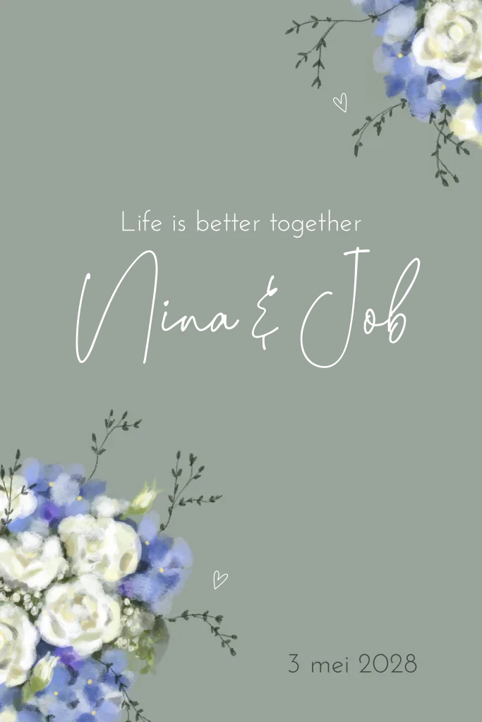 Een mooie trouwkaart met op een groene achtergrond handgeschilderde hortensia's en witte rozen in boeketvorm. De namen en de hartjes zijn gedrukt in goudfolie.