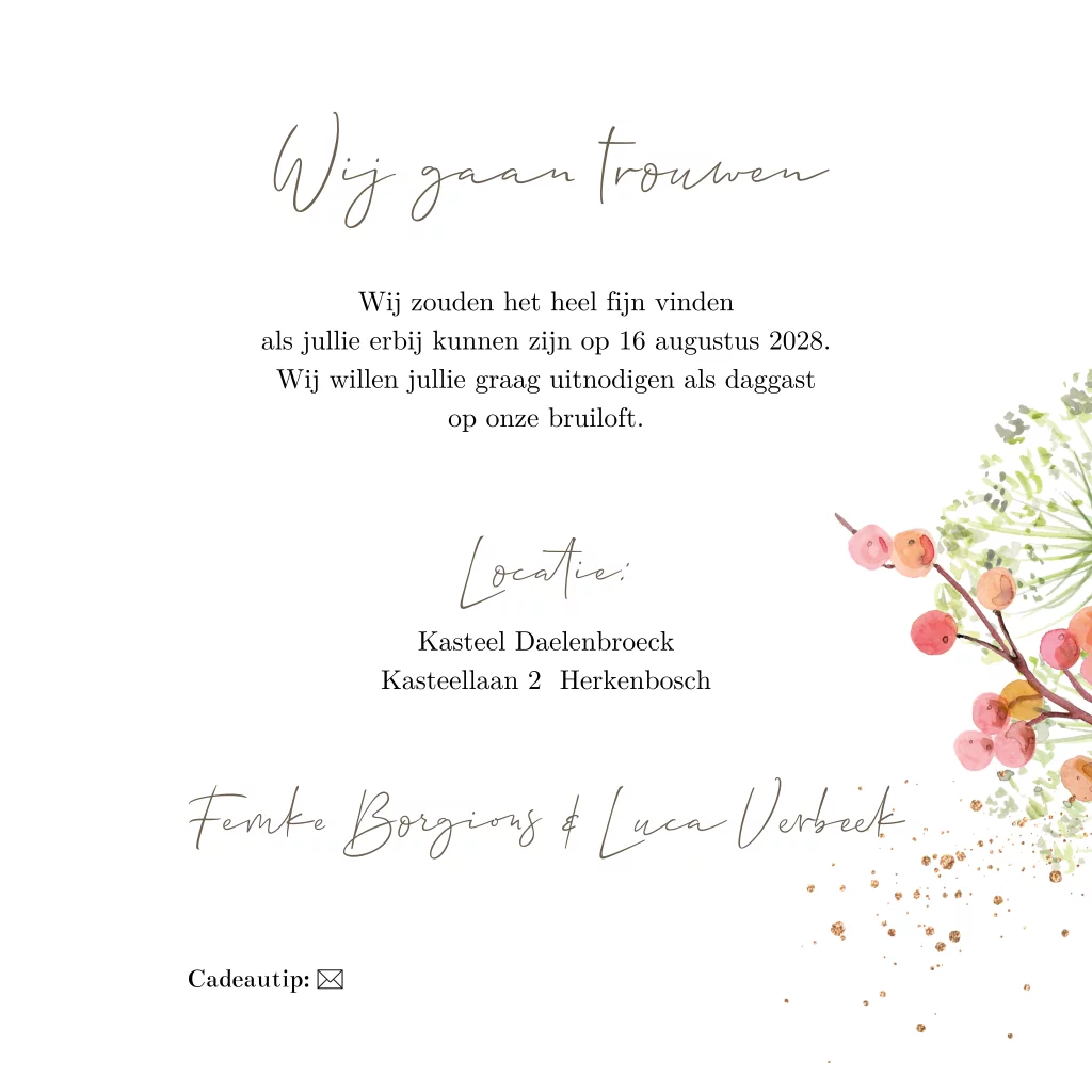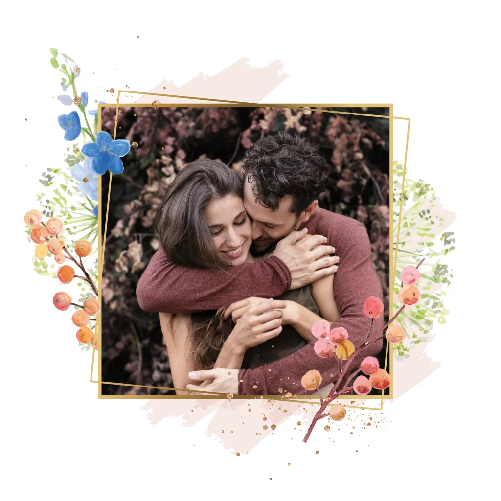 Trouwkaart met eigen foto in een geometrisch kader en spetters in goudlook. Achter de foto brushstrokes in roze watercolor en bloemen en takjes met besjes naast het kader.