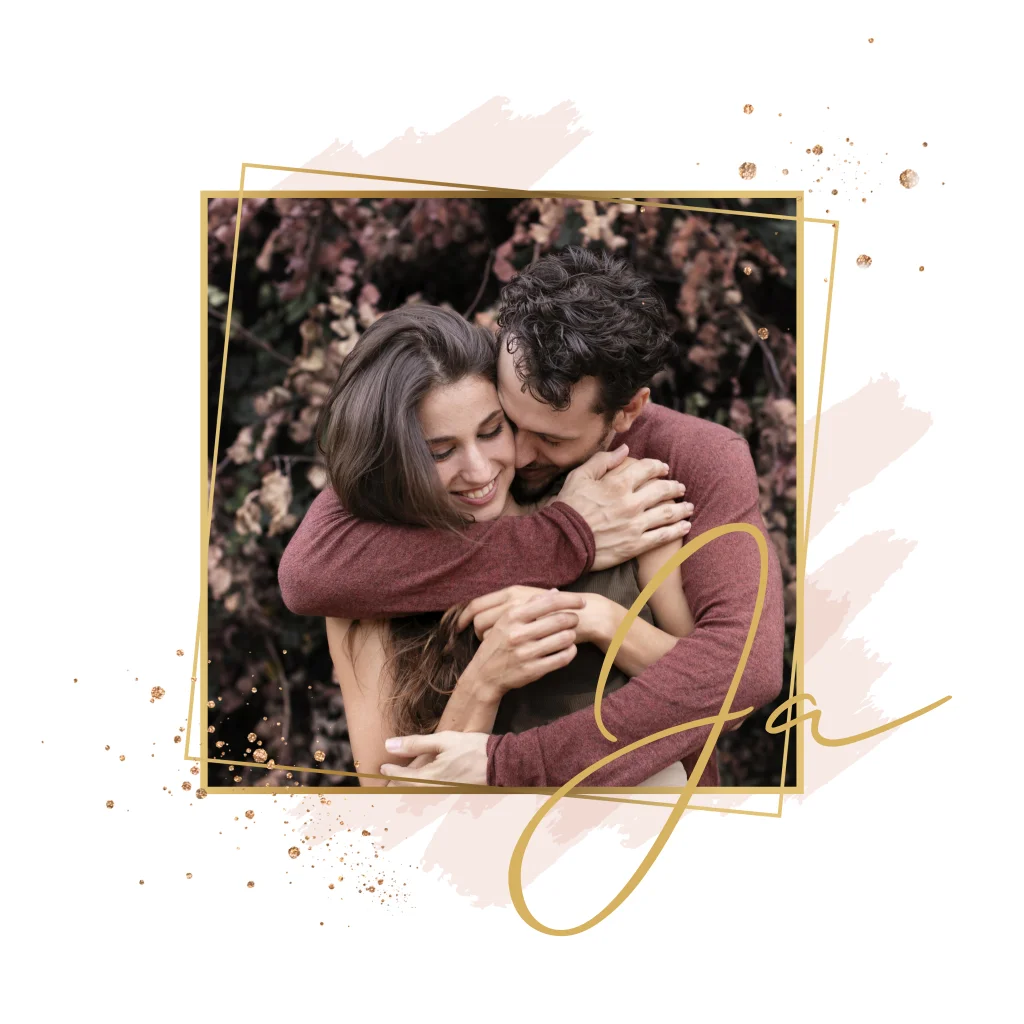 Trouwkaart met eigen foto in een geometrisch kader en spetters in goudlook. Watercolor brushstrokes achter de foto en het woord Ja erbij.
