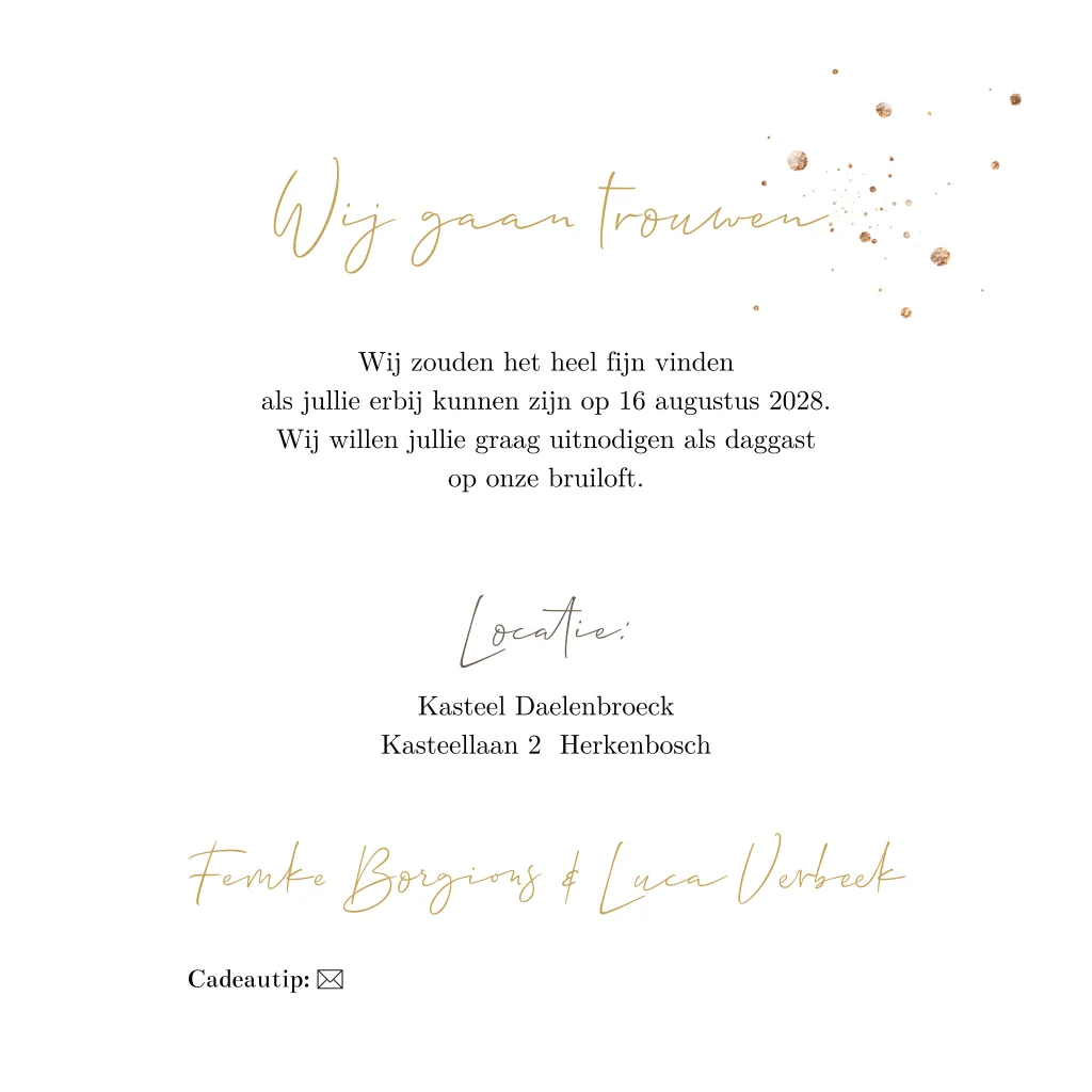 Trouwkaart foto geometrisch kader met spetters goudlook
