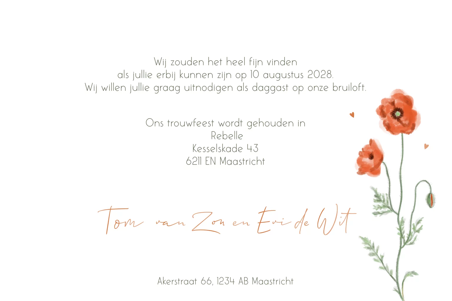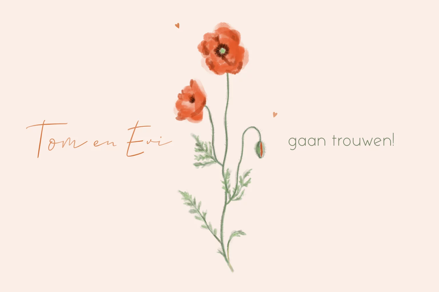 Een originele trouwkaart met een handgeschilderde rode papaver op een zachtroze achtergrond. De namen en de hartjes zijn gedrukt in hoogglans. Deze trouwkaart is eenvoudig zelf naar wens aan te passen