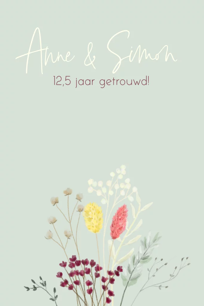Een mooie handgeschilderde jubileumkaart met kleurige droogbloemen voor een 12,5 jarig huwelijksfeest. Deze kaart is eenvoudig zelf naar wens aan te passen