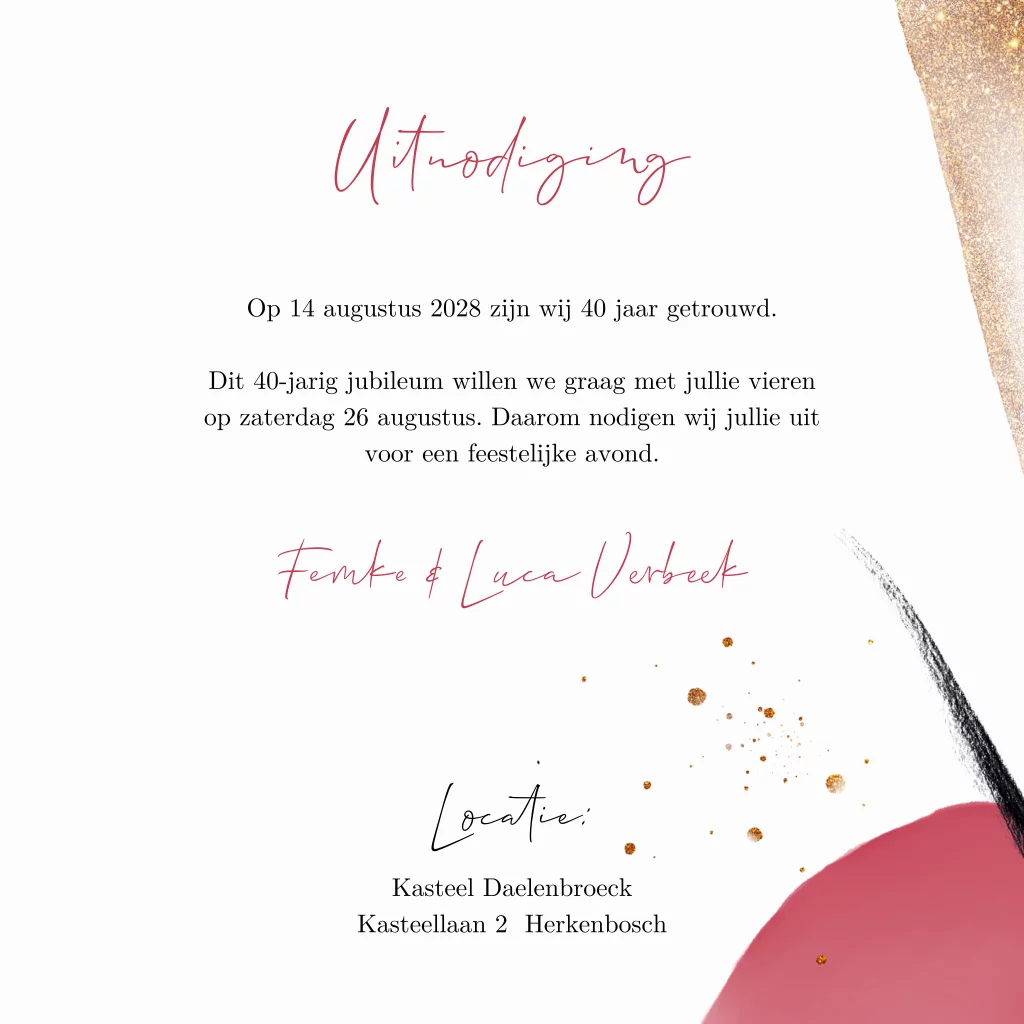 Kleurrijke uitnodigingskaart voor huwelijksjubileum met aquarelvlakken in de kleur robijn met brushstrokes en spetters in goudlook
