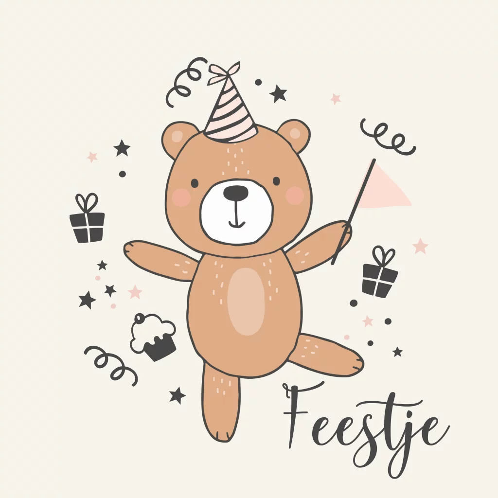 Uitnodiging voor een kinderfeestje van een meisje met een beer met vrolijke feest elementen in zwart en roze kleuren.